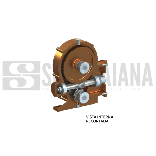 Caixa redutora com carcaça de bronze fundido, engrenagens de bronze e aço inox, fuso de aço carbono. Comumente aplicada em maquinas de descascar camarão.