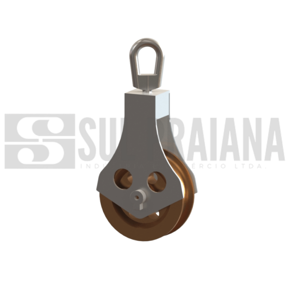 Catarina power block com caixa, olhal e eixo de aço inox 304; roldana em bronze ou aço inox fundido.