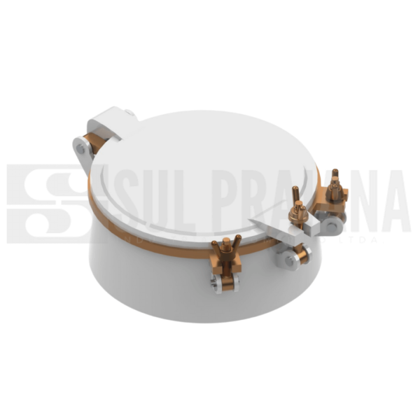 Vigia redonda móvel com cone de aço inox 304, tampa de bronze, vidro temperado e tampa de combate em alumínio. Pintura esmalte branco.
